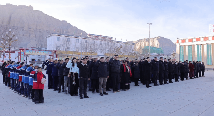 在庄严的国歌声中,护旗队迈着铿锵有力的步伐护送国旗入场,全体人员面向国旗肃立,齐唱中华人民共和国国歌,鲜艳的五星红旗在晨光中冉冉升起,激荡起全场浓厚的家国情怀与法治信仰。全县党政机关代表、学生代表、群众代表、寺庙僧尼代表、县离退休老干部代表、环卫工人代表等共115人齐聚札达广场,身着正装、佩戴徽章,以最庄重的姿态迎接这一神圣时刻。